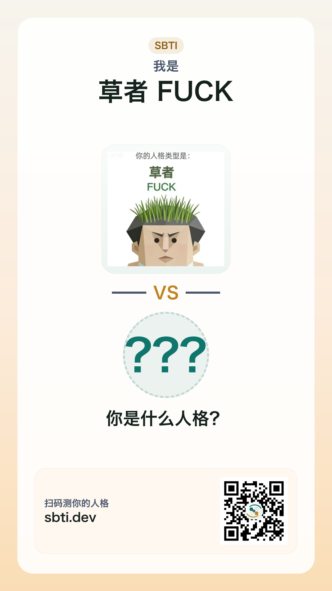 恭喜您!您根本不在人类范畴内!您测出了百万年一遇的【FUCK】人格。人类文明城市里,出现了一株无法被任何除草剂杀死的、具有超级生命力的人形野草——那就是草者人格。它的学名,就叫 FUCK。在FUCK的世界观里,世俗规则简直毫无意义,并且FUCK的情绪开关是物理拨片式的:FUCK YEAH 和 FUCK OFF。FUCK追求的不只是当下快感,也在追求一种在体内横冲直撞的生命力。当所有人都被驯化成了温顺家禽,FUCK则是荒野上最后那一声狼嚎。